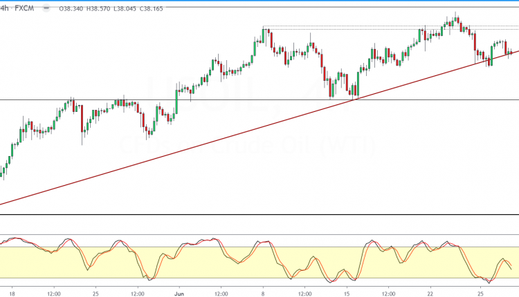 Oil prices maintain a soft trend with prices hugging the rising trend line.