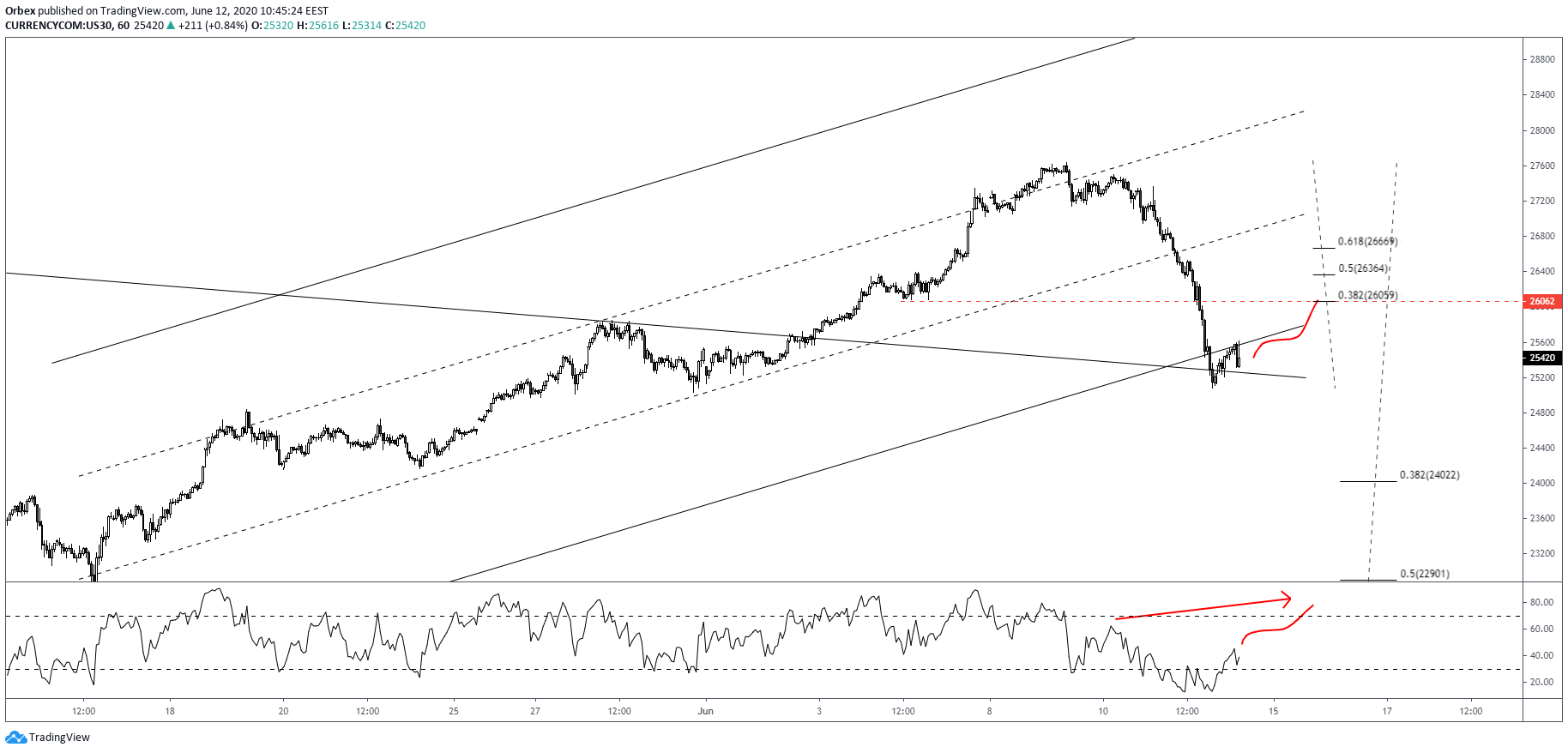 Often, the first attempt to either enter or exit a channel fails. This is what we currently see. In case we re-enter the channel in the second attempt, the US30 index could begin a sharp fall towards the 50% and even the 78.6% Fibonacci retracement levels at 22900 and 20180, respectively.
