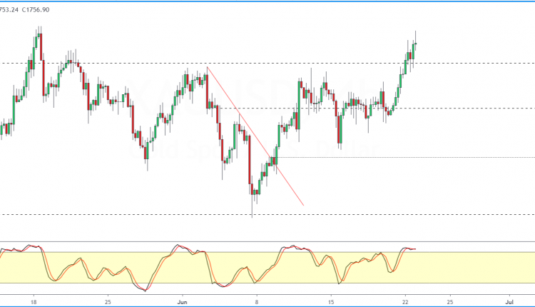 However, after rising to intraday highs of 1762.96, price action is pulling back sharply. This could potentially result in a doji candlestick pattern.
