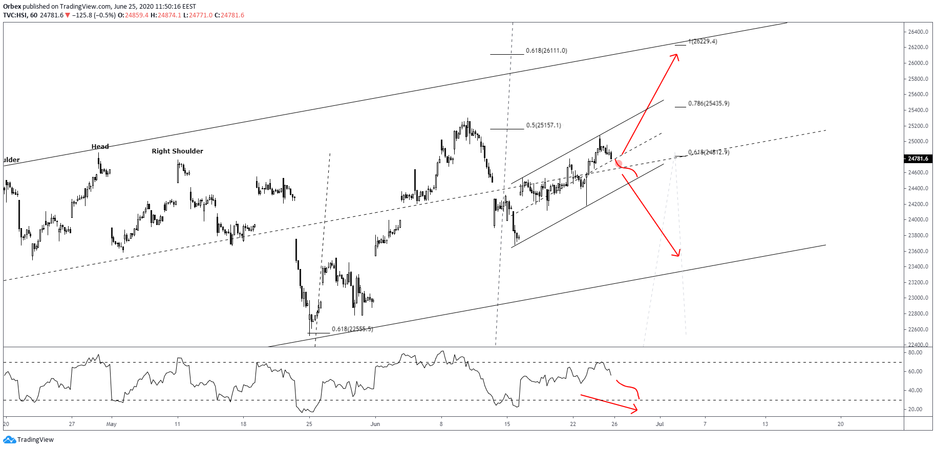 The Head & Shoulders identified on May 25th offered a bullish opportunity near 22560. Since the bounce at the golden ratio, prices have marked fresh highs above the 25000 round resistance.