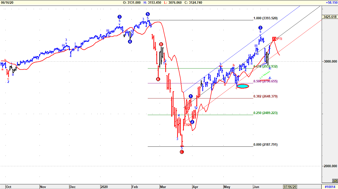 L’indice S&P500 uncina un nuovo rialzo dai minimi segnati a 2,932, proprio quando si pensava che il ribasso potesse riconfigurarsi in modo chiaro. Abbiamo quindi assistito alla più classica delle trappole ribassiste, giocata sulle dichiarazioni della FED lo scorso 10 giugno. Ovviamente l’immensa liquidità immessa nel sistema dalla Banche Centrali di tutto il mondo sortisce gli effetti sperati, sfidando anche le leggi della fisica. La configurazione tecnica dell’S&P500 inizia a delinearsi in maniera più chiara, incastrando il rialzo attuale a definizione di Onda 5 rialzista del ciclo impulso partito sui minimi di marzo. Si attende il riattacco ai massimi più recenti a 3,236 per definirne meglio i connotati. Supporto a 2,932.