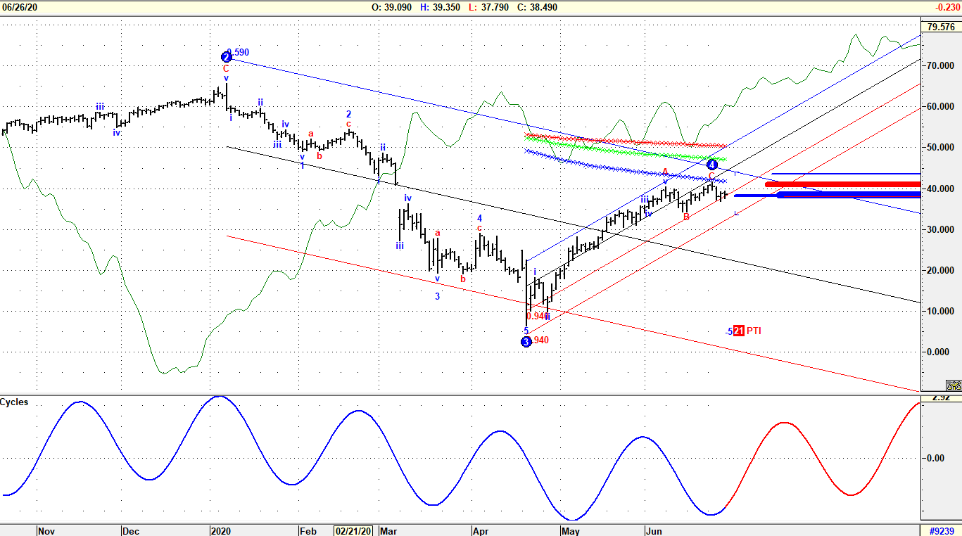 L’intensa attività da parte dell’OPEC sui tagli alla produzione e il maggioro assorbimento di scorte da parte dell’economia mondiale hanno permesso il rafforzamento delle quotazioni del greggio con contestuale stabilizzazione proprio a ridosso di quota 40 USD al barile e riallineamento su livelli abbandonati in occasione del grande crosso di marzo-aprile. Il quadro tecnico generale evidenzia in linea teorica un perfetto incastro di Onda 4 del processo impulsivo ribassista originato sui massimi di inizio anno a quota 65, ma la sequenza anomala tra movimenti secondari e minori rende la struttura piuttosto complicata da mappare. Preferendo approcci più pratici, si può dire che il continuo ruotare delle quotazioni in area 40 permette di identificare un livello di supporto “invisibile” su 2 STDV, cioè a quota 38.50, sotto la regressione dell’impalcatura originata sui minimi di aprile. Ottimi supporti volumetrici sono individuati tra 38.25 e 38.50. Evidente negatività solo sotto 35.