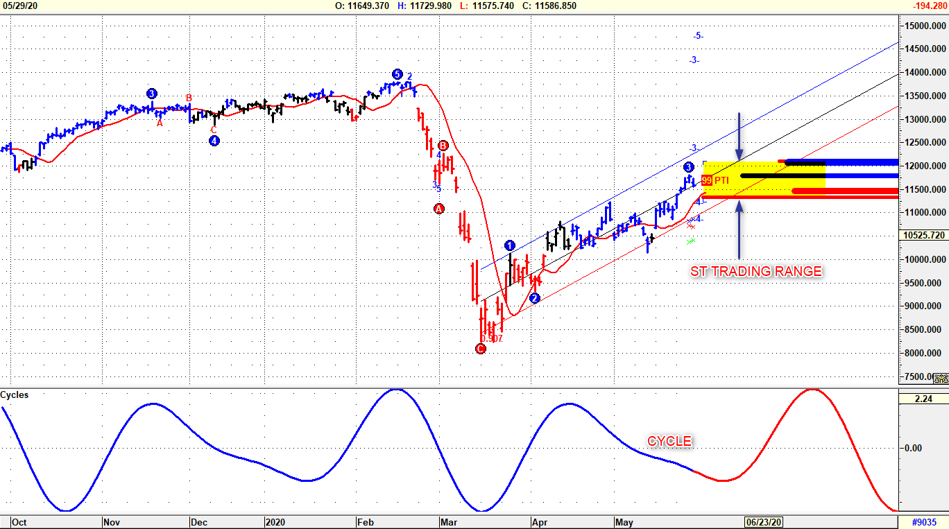 L’indice DAX sta esprimendo un trend rialzista fulcrato sui minimi di Marzo ben inscatolato in un canale di regressione piuttosto preciso e con le quotazioni in appoggio sulla retta di regressione a 11,550. Strutturalmente la situazione osserva un possibile innesco correttivo di breve portata con target ribassista compreso tra quota 11,750 e 10,850. L’impressione che si ricava tuttavia è quella di una permanenza in un trading range più contenuto, con supporto “invisibile” individuato 2 STDV sotto la suddetta retta di regressione e più precisamente in area 10,900. Da seguire la fase ASINCRONA rispetto al FORMAT CICLICO che osserva adesso una maggior propensione ribassista prima di riprendere quota dopo la metà di Giugno. Per le implicazioni tecniche assunte la settimana entrante si presenta in fase di re-set prima di uno sblocco direzionale, visto verosimilmente al rialzo per quella successiva.