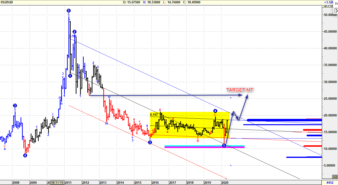 Proponiamo un grafico di lungo periodo su barra mensile, per far rilevare le potenzialità inespresse per l’Argento, che resta parecchio indietro rispetto all’Oro se si guarda ai massimi del 2012 segnati a quota 50 dollari. I minimi segnati a quota 11.5 lo scorso Marzo sono considerati di valore assoluto, da dove si è poi dipanata una fase rivalutativa più aggressiva rispetto all’Oro, come in anticipo era stato rilevato dal Gold/Silver ratio, caduto alla fine di Marzo in maniera scomposta. La vicinanza con la resistenza più immediata a 18.5 dollari, potrebbe incoraggiare delle prese di beneficio con pullback verso quota 17.5. Da quel livello si potrebbe poi rientrare LONG tenendo in considerazione una ripresa, seppur parziale, dell’economia, visto che l’Argento ha un peso industriale maggiore rispetto all’Oro.