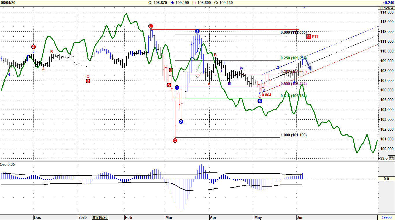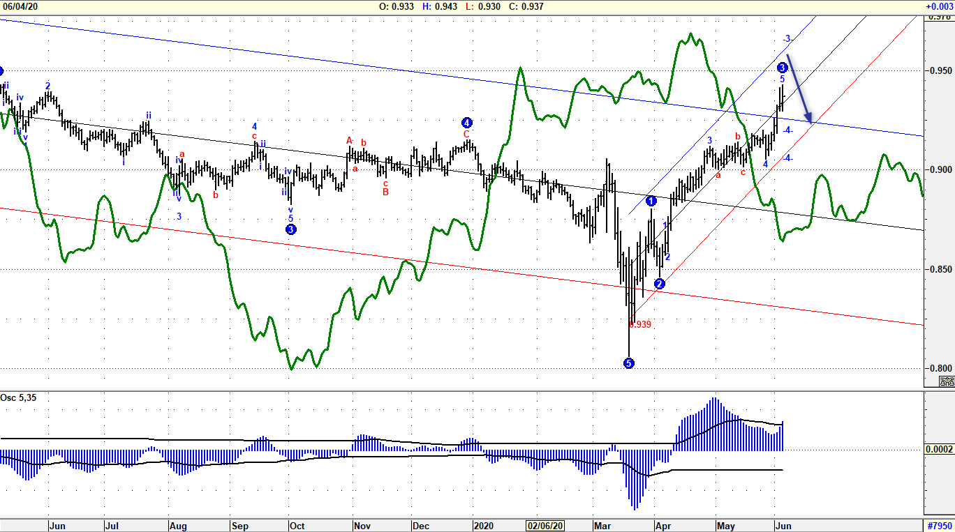 Inaspettata forza per AUDCAD che spinge al rialzo dopo aver ruotato intorno al polarizzante livello stimato a 0.914, pur configurando una componente stagionale negativa (grafico verde). E’ lecito pensare che il prepotente rimbalzo dai minimi di marzo possa essere prossimo alla conclusione per diversi motivi e quello del movimento asincronico tra ciclo di prezzo e stagionalità è uno di quelli più importanti. Da seguire adesso le modalità dell’eventuale correzione che sembra delinearsi, con incastro di Onda 4 e target posto tra 0.91 e 0.925, prima di un rilancio sopra i massimi a 0.94. A matrice positiva le indicazioni lette in prospettiva sui grafici settimanali.