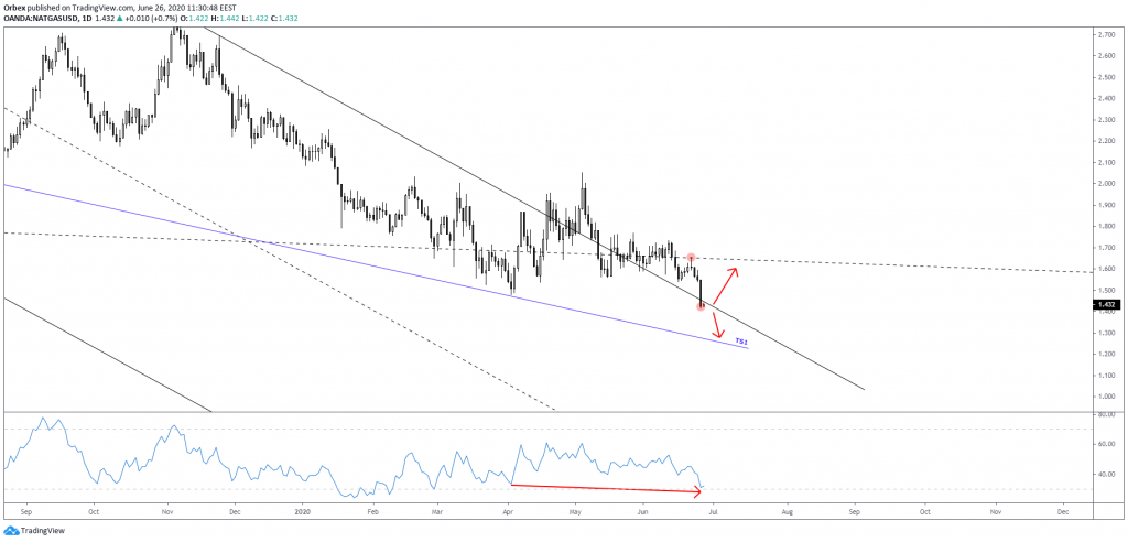 The consolidation, on the other hand, is expected to cause a rapid fall to fresh lows. And we can expect TS1 support to be the next target. However, a false break could be also seen, just below the 25-year low marked yesterday.