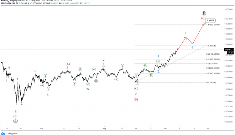 NZDUSD seems to be developing a bearish Ⓐ-Ⓑ-Ⓒ zigzag of the primary degree. Wave A formed a 5-wave impulse pattern, whereas wave Ⓑ seems incomplete.