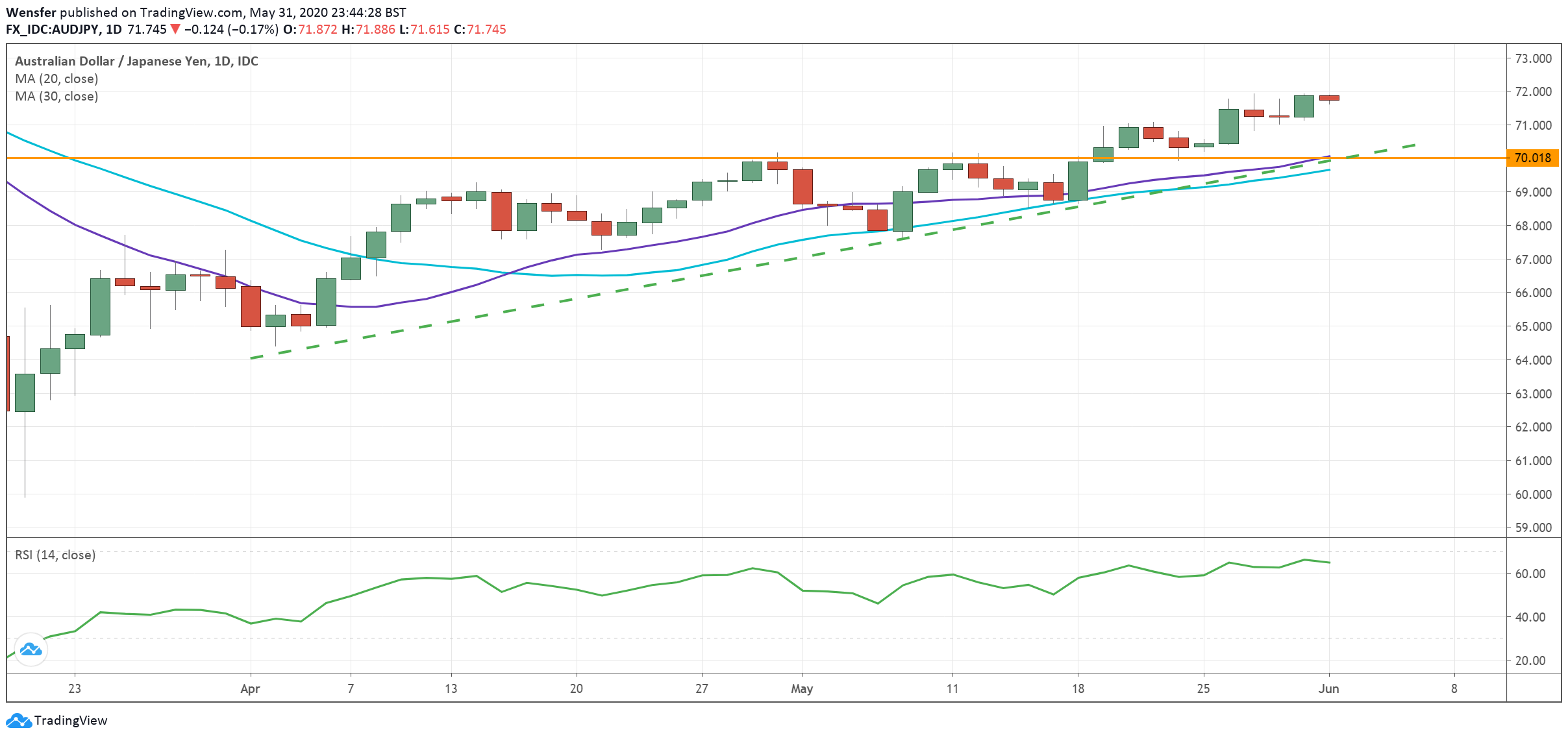 Sentiment remains bullish after the pair rallied above the March high of 71.40. 70.00 near the moving averages is the first line of defense in case of a pullback.