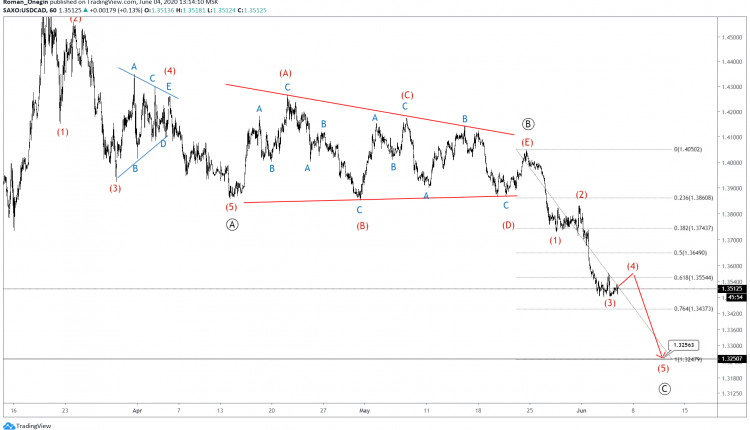 The current USDCAD structure hints to a bearish zigzag consisting of primary sub-waves Ⓐ-Ⓑ-Ⓒ.