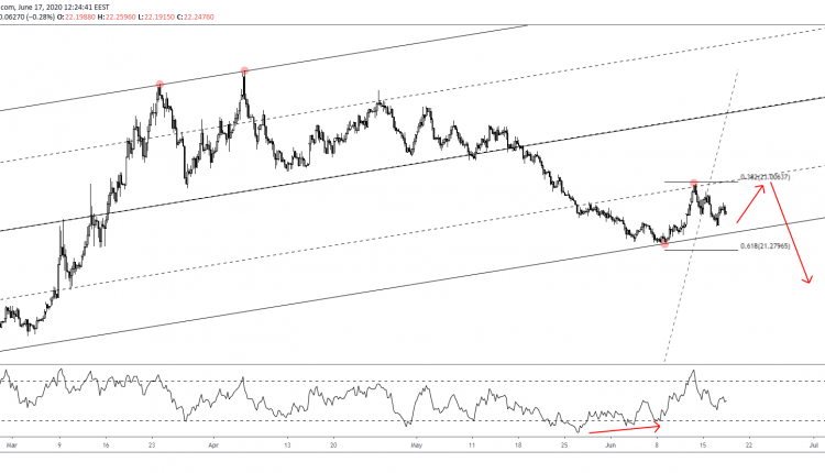 When taking into account the weak bearish attempt to take out the 61.80% Fibonacci at 21.279, chances to revisit the support level are good. This can come after a weak bullish attempt towards the 23.00 level or before.