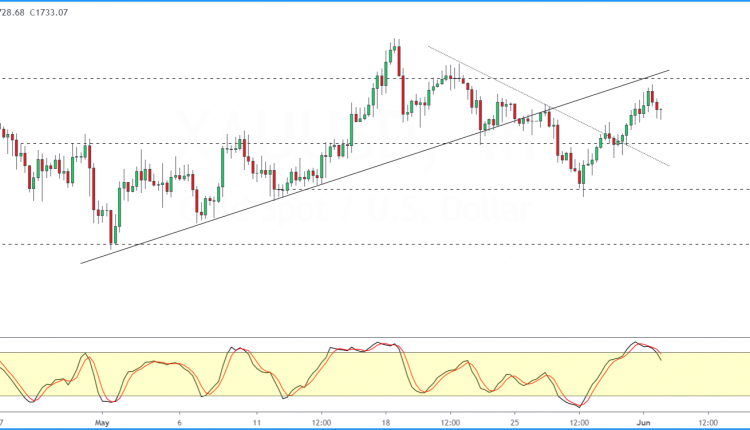 In the near term, the lower support at 1717.65 might be able to stall the precious metal from declining further.