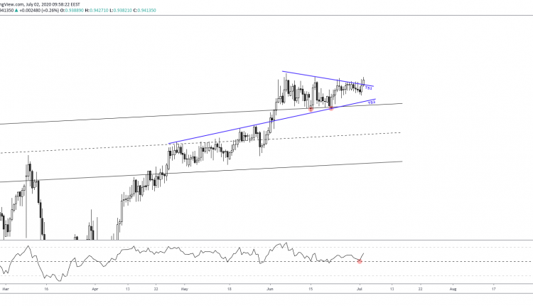 The resistance at the 0.9461 Fibonacci extension will determine the short-term direction should the previous high at 0.9445 break. The RSI (14) points at an upside move, which suggests that the said level could be revisited soon.