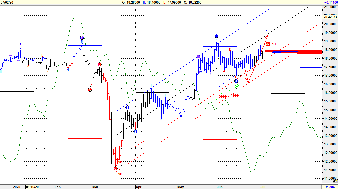Come commentato nel precedente report, l’Argento è alle prese con una fase di consolidamento in stretta correlazione all’andamento dell’Oro, ingabbiato in una fase di prolungata lateralizzazione. Per le implicazioni tecniche assunte è sempre attiva la fase di “metal-rotation”, cioè una maggior attenzione degli operatori focalizzata adesso sull’Argento più che sull’Oro. Logica confermata dal “washout” di marzo e quello più moderato di maggio, mostrato chiaramente dal Gold/Silver ratio. Questa dinamica di ricompressione del rapporto tra i due metalli fa emergere un recupero di forza relativa da parte dell’argento che, superata la resistenza tecnica su quota 18.90, intercettata dalla retta di regressione che ne controlla gli sviluppi rialzisti dai minimi di marzo, punterebbe prima verso area 19.40 e successivamente a 20.15.