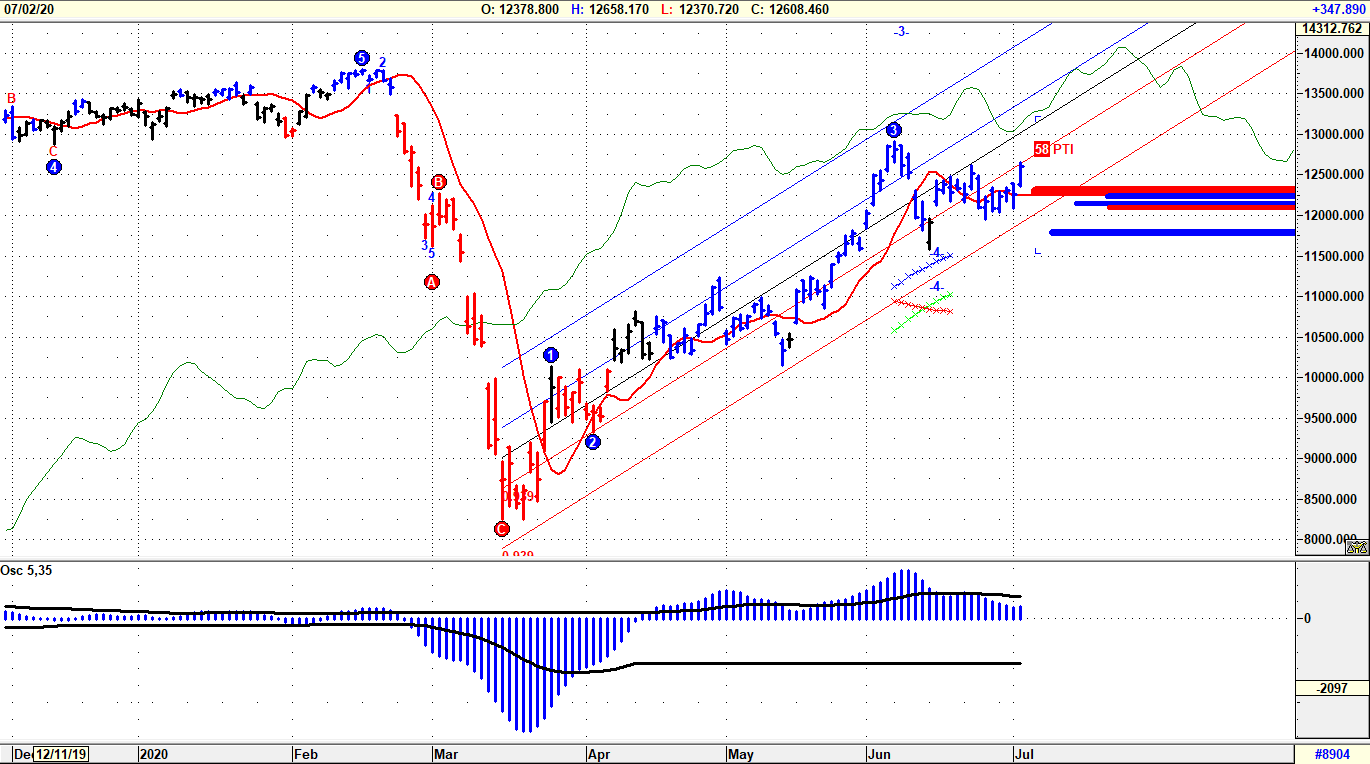 Precisa e puntuale l’analisi precedente sull’indice DAX, che dopo aver reagito sui minimi di marzo a quota 8,200, si è incanalato al rialzo con una struttura ben controllata da una retta di regressione regolarmente inclinata, con oscillazioni controllate puntualmente 2 STDV sotto e sopra la suddetta retta. Anche se il Dax è un indice di tipologia “breakout”, cioè che esprime tutte le sue potenzialità in accelerazione, aggregando volumi in entrata sulle fasi di rottura direzionali, in quest’ultimo periodo sembra “lavorare” bene la fase di “mean reverting” circoscrivendo gli eccessi di questa evoluzione rialzista su 3 STDV. La breve correzione fulcrata sui massimi a 12,913 va ad incastrarsi come Onda 4 e pur ammettendo degli inerziali scivolamenti in avanti, il DAX potrebbe essere già pronto per il rilancio di Onda 5 a caccia dei massimi assoluti.