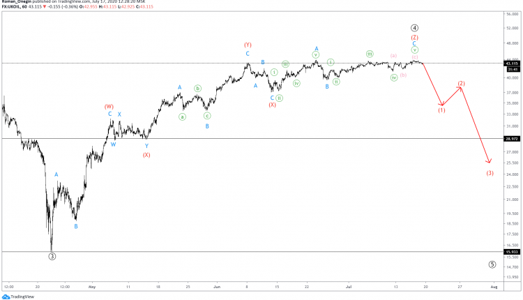 We expect the commodity to fall below the previous low formed by intervening wave (X), at 28.97.