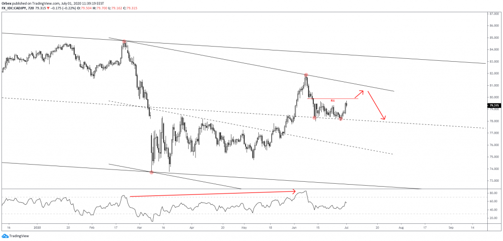 The pair has not yet filled the long-term descending regression channel range at the upper trendline near 83.00. However, the miss of the 82.00 round resistance on June 05 raises the chances of a July decline.