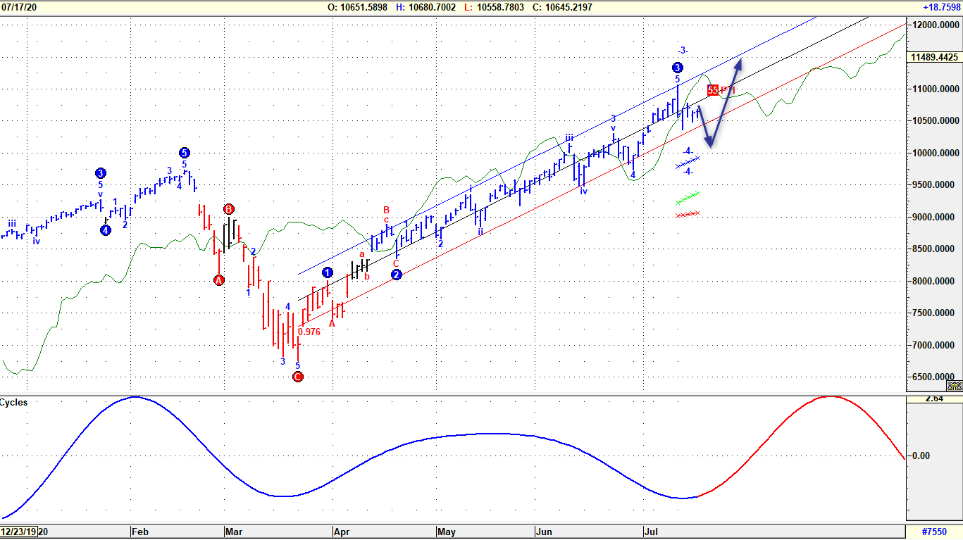 L’impostazione tecnica per l’indice NASDAQ100 rimane al momento a propensione rialzista, considerando margini di ulteriore upside in forza della ciclicità a lettura positiva (Grafico sottostante). Le implicazioni tecniche assunte estratte dal quadro degli indicatori sono largamente positive, ma si ritiene che il rialzo in corso possa essere giunto a ridosso di una fortissima resistenza tecnica stimata proprio in area 11.000 e già testata in condizioni di elevato eccesso volumetrico. Solo sopra tale livello potrebbero concretizzarsi nuovi allunghi con target a quota 11,320. Al momento è in fase di set-up Onda 4 correttiva che osserverebbe un’area di approdo teorica tra 9,400 e 10,000. Eventuali manifestazioni correttive sono per il momento controllate 2 STDV sotto la retta di regressione originata sui minimi dello scorso Marzo.