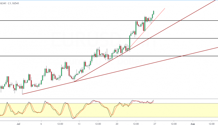 The strong price action move will be determined by the third rising trend line. A breakout of this trend line will potentially push the euro lower for a correction.
