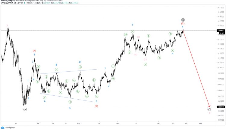 The EURUSD structure hints at a bearish Ⓐ-Ⓑ-Ⓒ zigzag of the primary degree.
