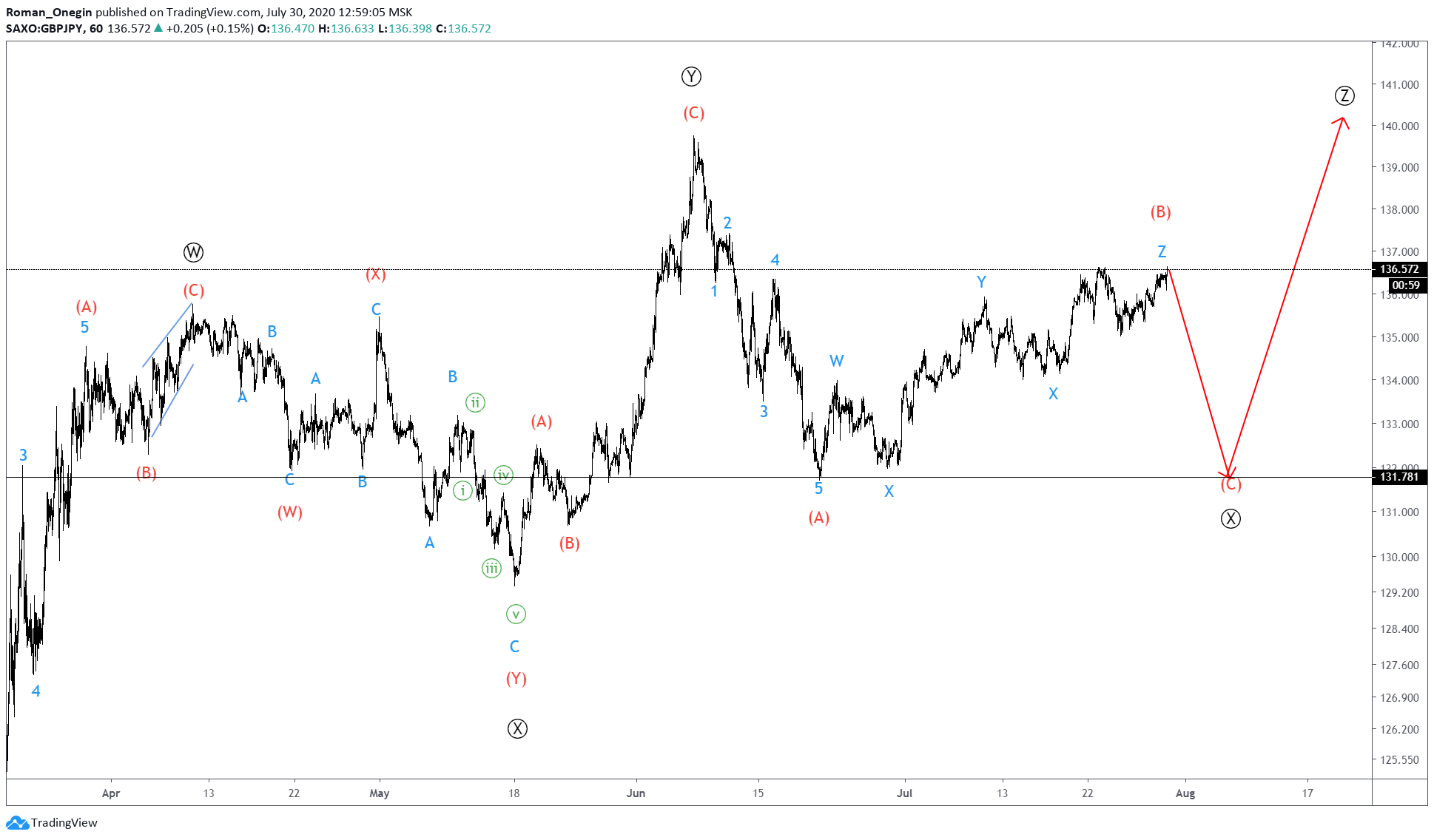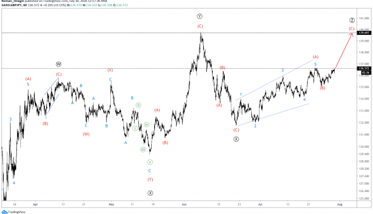 The current GBPJPY formation hints at a triple zigzag formation. The primary degree pattern consists of waves Ⓦ-Ⓧ-Ⓨ-Ⓧ-Ⓩ.