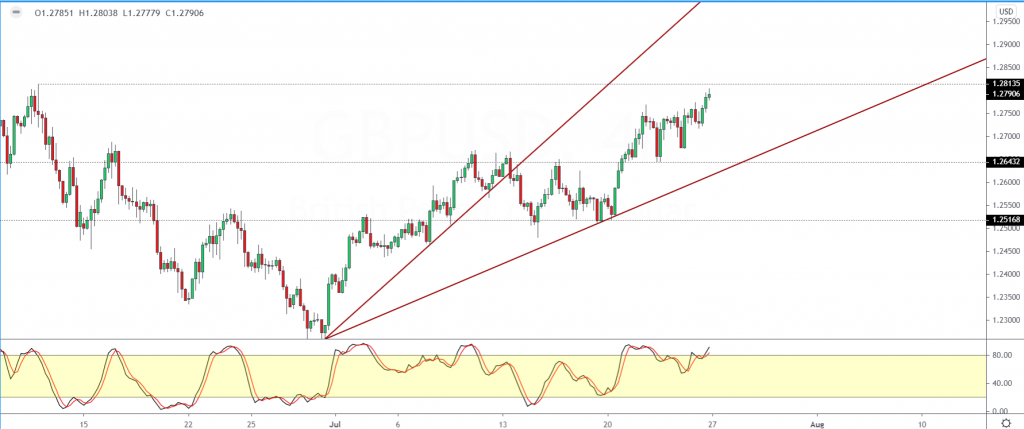 Price is now just a few pips away from the key technical resistance of 1.2813. A close above this level will see GBPUSD rising to a four-month high.