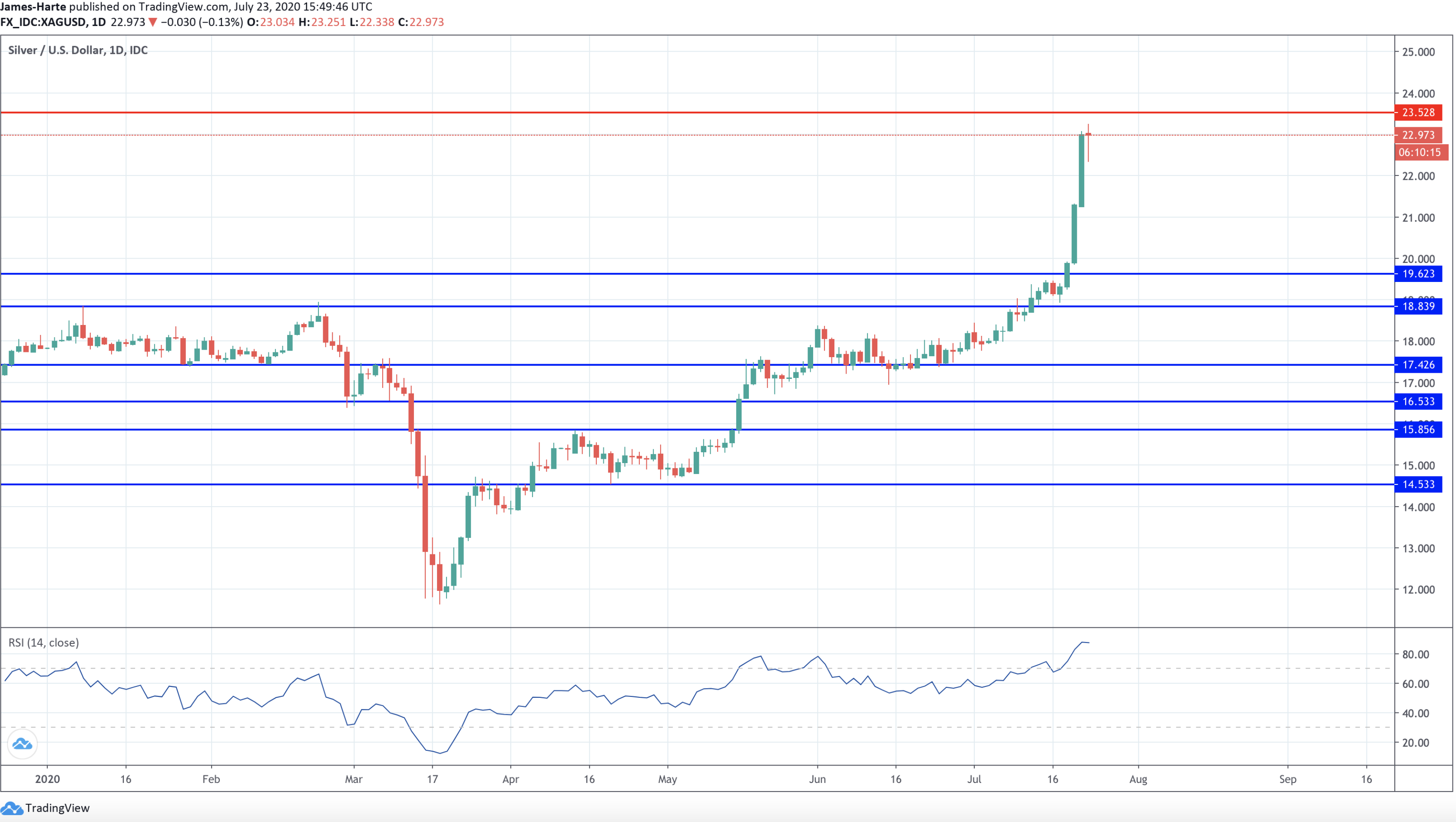Silver prices have seen a similarly explosive move this week. Price broke out well above the 19.62 level, on course to retest the 23.52 level next. Silver has been supported by the weakness in the US dollar as well as the strength in equities, particularly industrial equities.