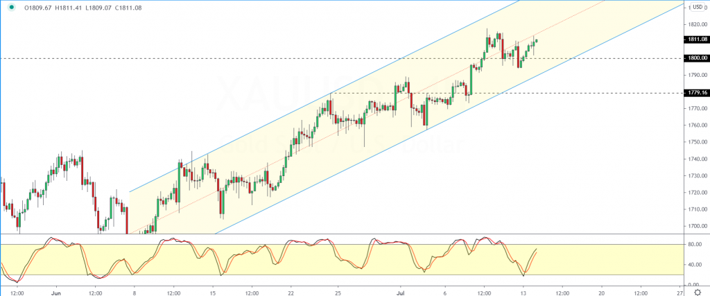 The precious metal is trading comfortably above the 1800 level on Monday. Price action briefly dipped to the psychological round number level to establish support.