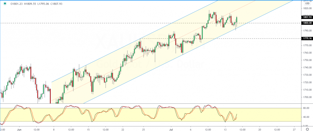 However, price action was rejected at this level, pushing gold to close above 1800.