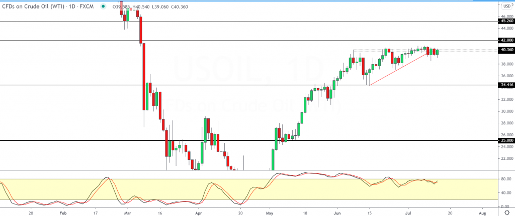 Oil prices remain firmly entrenched in a sideways pattern. The strong resistance area near 40.36 – 40.50 level is so far proving hard to break.