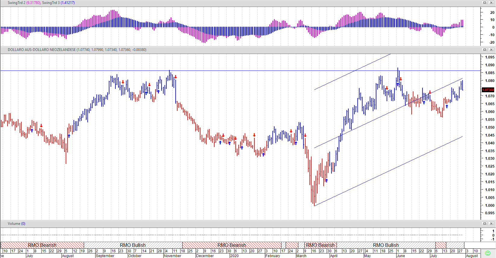 La MM a 21 giorni costituisce un buon supporto per AUDNZD che su base 1.07 sembra aver costruito un robusto supporto e dove per altro incrocia un riferimento regressivo pari a 2 STDV rispetto alla retta di regressione originata sui minimi dello scorso marzo. Sempre positivo il quadro tecnico a cui guardano potenziali nuovi acquirenti. Qualche dubbio resta sul MACD, laddove tendenze più lente hanno metabolizzato il ribasso dello scorso giugno, configurando delle divergenze. In sintesi, l’impostazione sul breve e medio periodo rimane al momento a propensione rialzista, con supporti più immediati visti in area 1.07. Sotto tale livello potrebbero concretizzarsi le possibilità di interessare al ribasso quota 1.065, cioè testare supporti “invisibili” intercettati 2 STDV sotto la suddetta retta regressiva. In questo contesto la fase positiva dell’ORO continuerà a premiare la valuta australiana rispetto a quella neozelandese.