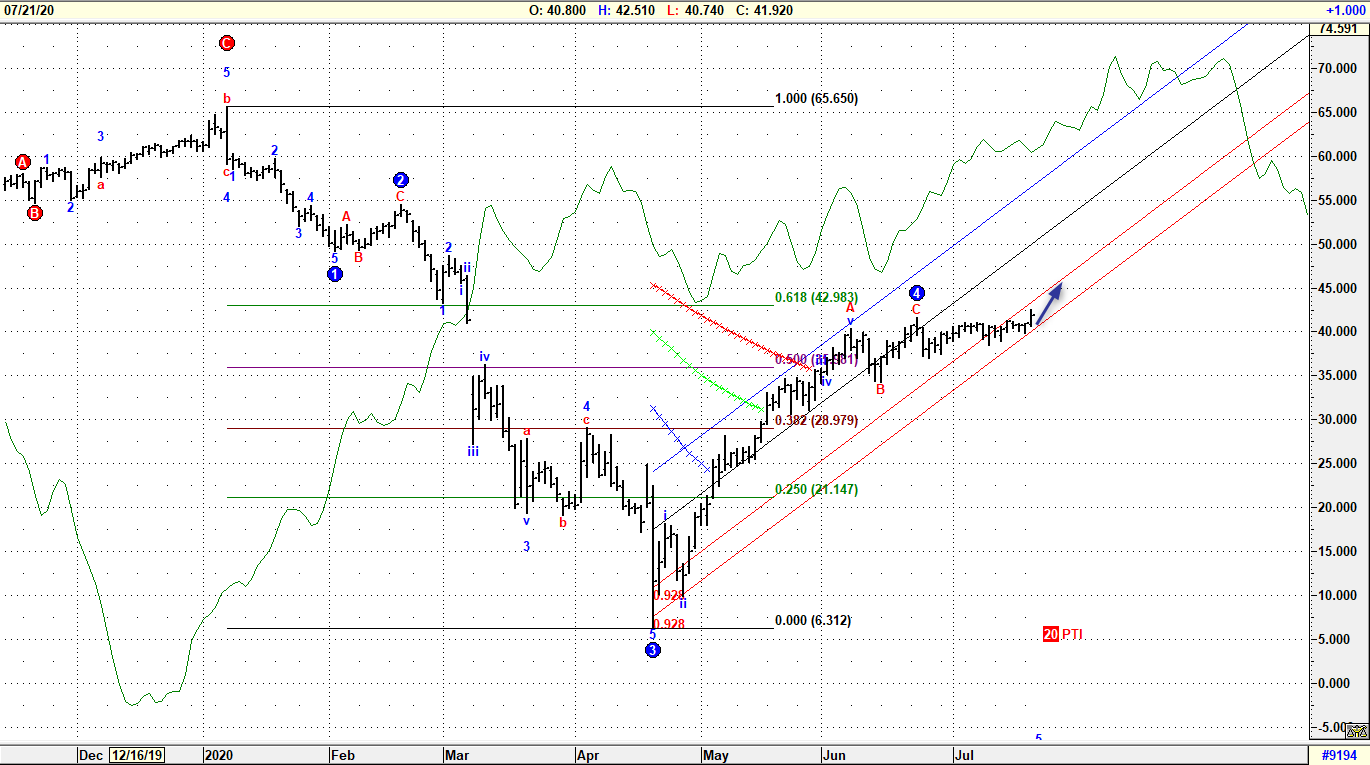 Il quadro tecnico generale evidenzia in linea teorica uno sganciamento dallo scenario che inizialmente prevedeva un incastro di Onda 4 del processo impulsivo ribassista originato sui massimi di inizio anno a quota 65, ma la sequenza anomala tra movimenti secondari e minori ha obbligato a prevedere uno scenario alternativo ancora in via di definizione e comunque piuttosto complicato da mappare. Preferendo approcci più pratici, si può dire che il continuo ruotare delle quotazioni in area 40 ha certificato la valenza tecnica dell’approccio regressivo con un livello di supporto “invisibile” su 3 STDV, cioè in area 40, sotto la regressione dell’impalcatura originata sui minimi di aprile. Resistenza tecnica a ridosso della regressione su base 42.50.