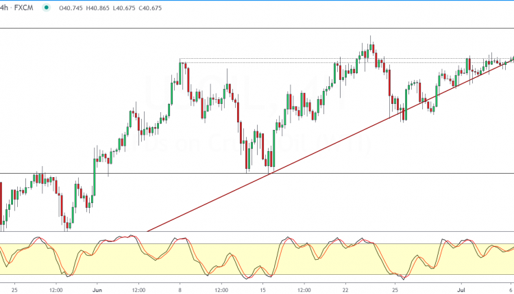 Crude oil prices continue to trade softly with prices holding on above the 40.00 handle. But price action is now challenging the rising trend line from below.