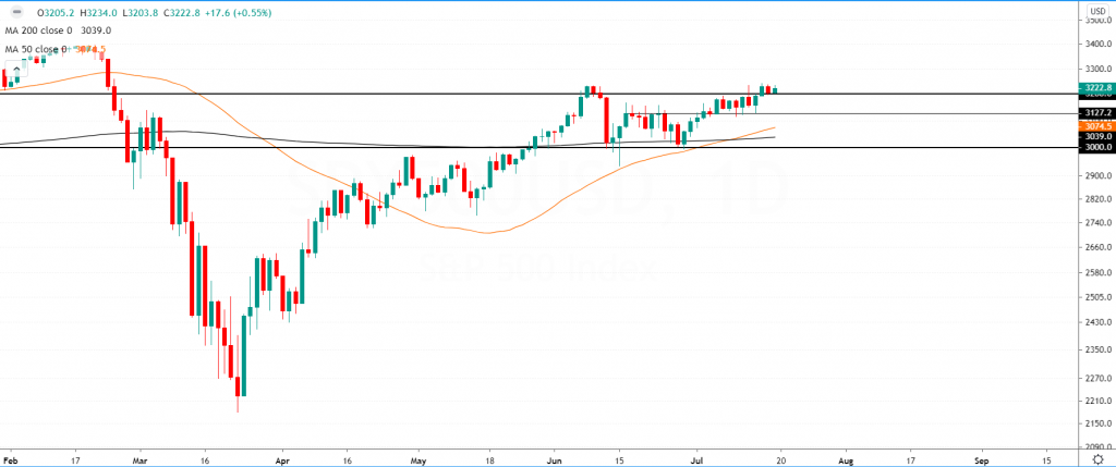 This marks the third consecutive weekly gain in the index. Price action is now near the previous highs from early June and is trading near the resistance area of 3200.