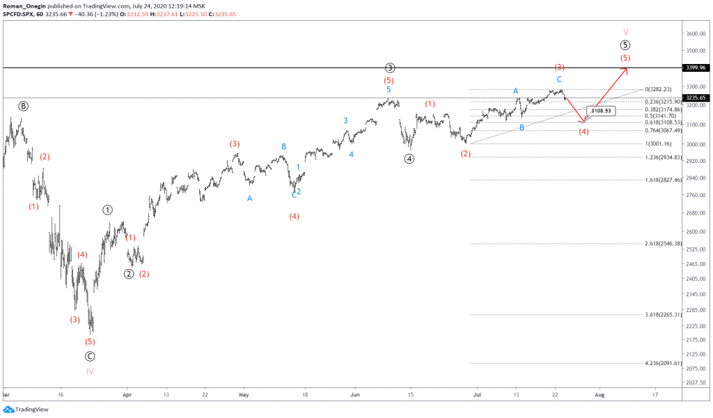 With waves (1)-(2)-(3) completed, we expect a bearish correction in wave (4), near 3108. This will be at 61.80% of intermediate impulse (3).