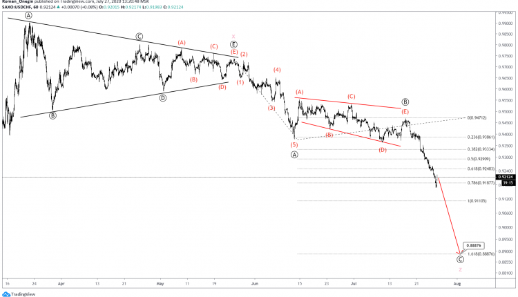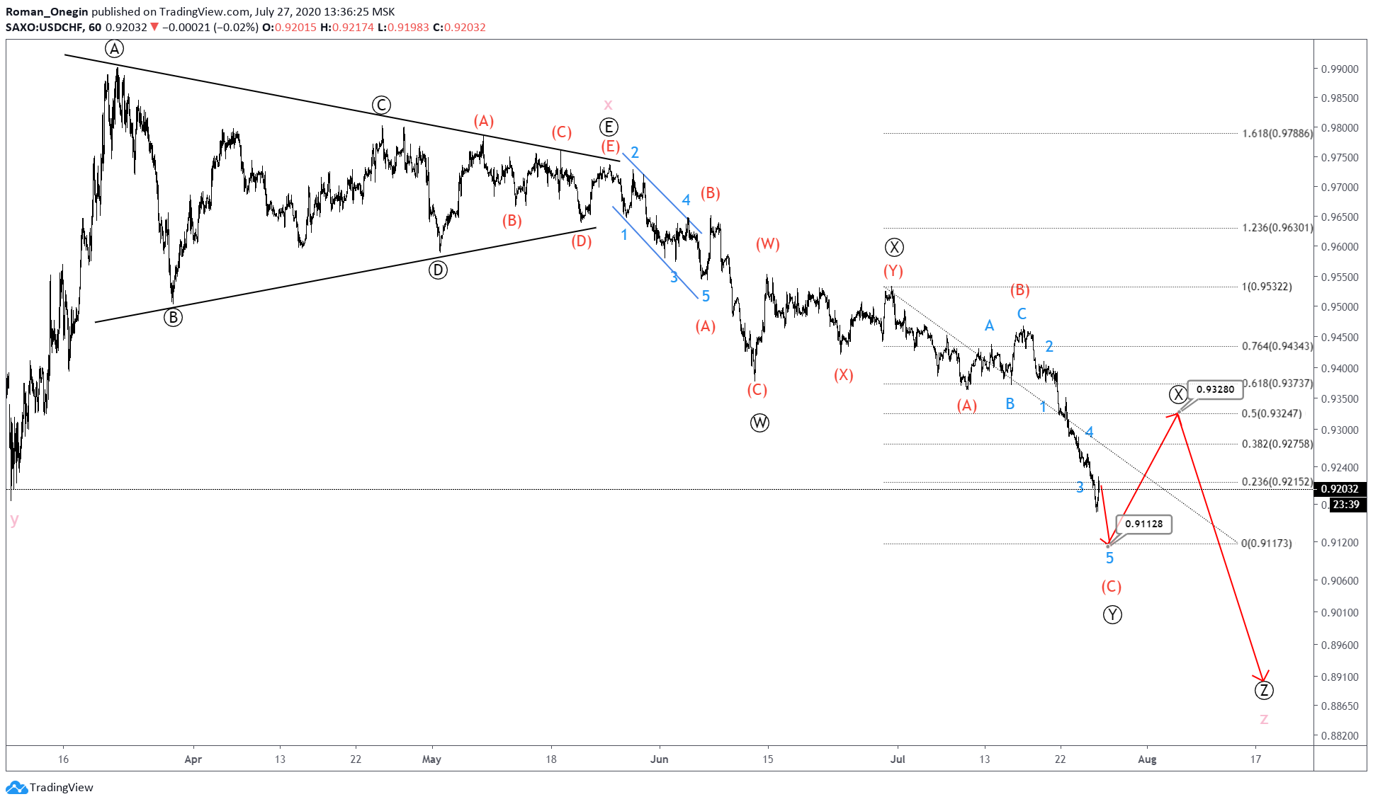 The USDCHF structure hints at a triple zigzag ending in wave z. The cycle degree correction consists of a primary degree Ⓐ-Ⓑ-Ⓒ zigzag.