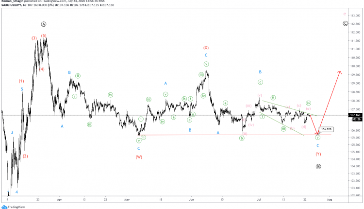 We expect wave C to complete its course on the 106.02 support as an ending diagonal.