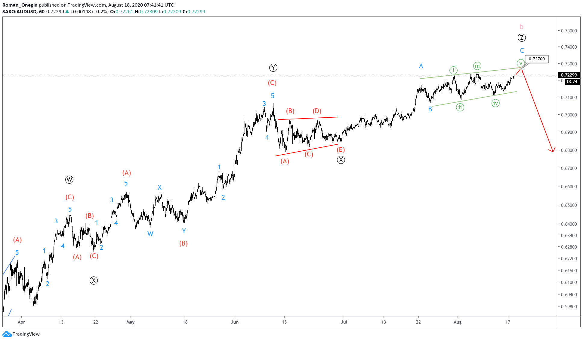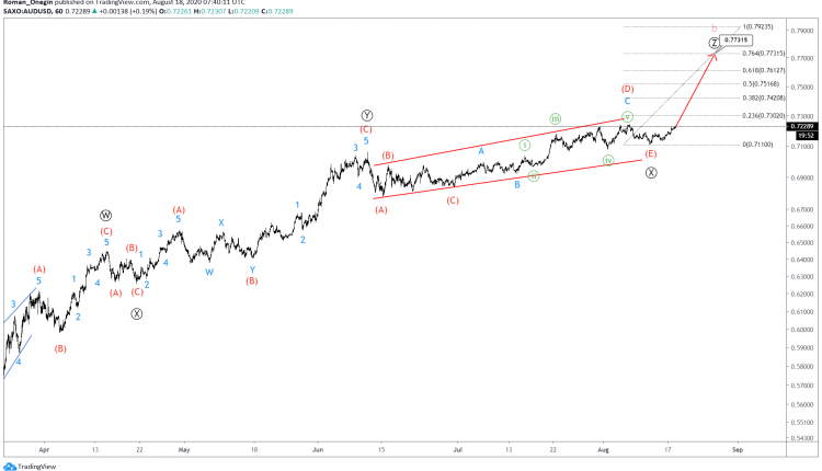 AUDUSD seems to be forming a triple zigzag pattern consisting of sub-waves Ⓦ-Ⓧ-Ⓨ-Ⓧ-Ⓩ.