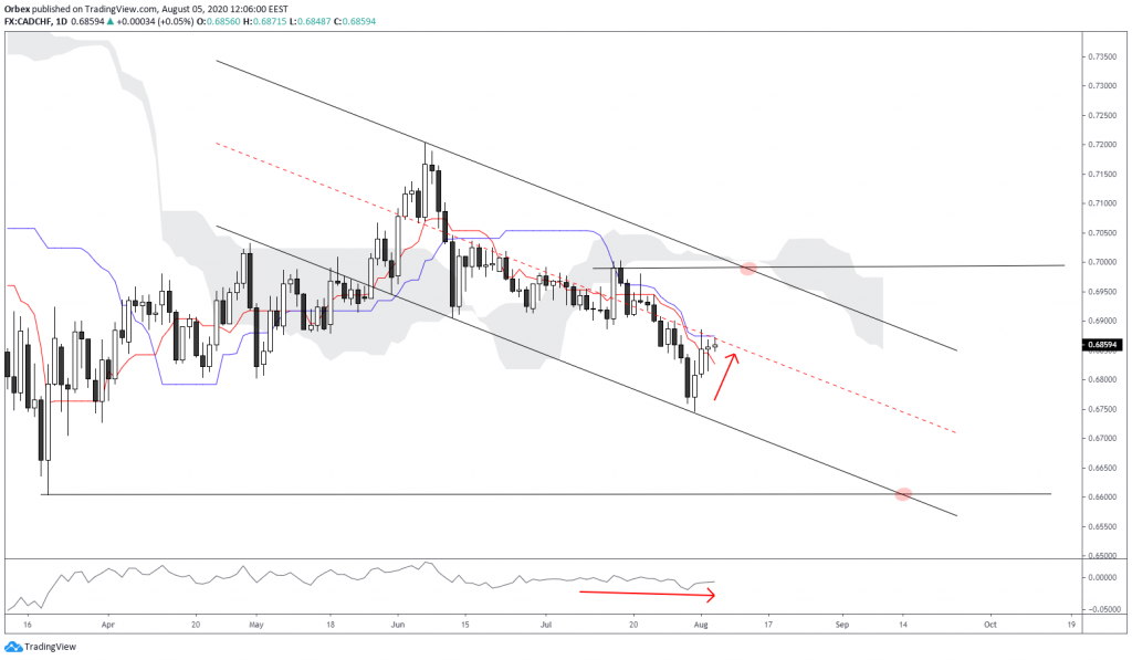 On the other side, a bullish break through the median regression could support the long-term notion of a push to the 0.77 target. This is bolstered by prices currently trading above the Ichimoku.