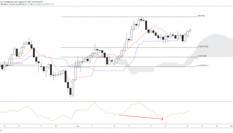 The short-term perspective looks at bullish momentum past the Tenkan and Kijun lines. However, a resistance seen at the 80.50 area could mean that momentum is exhausted. The indicator also hints at a bearish diversion which could see prices moving towards the 38.2% of the Fibonacci retracement.