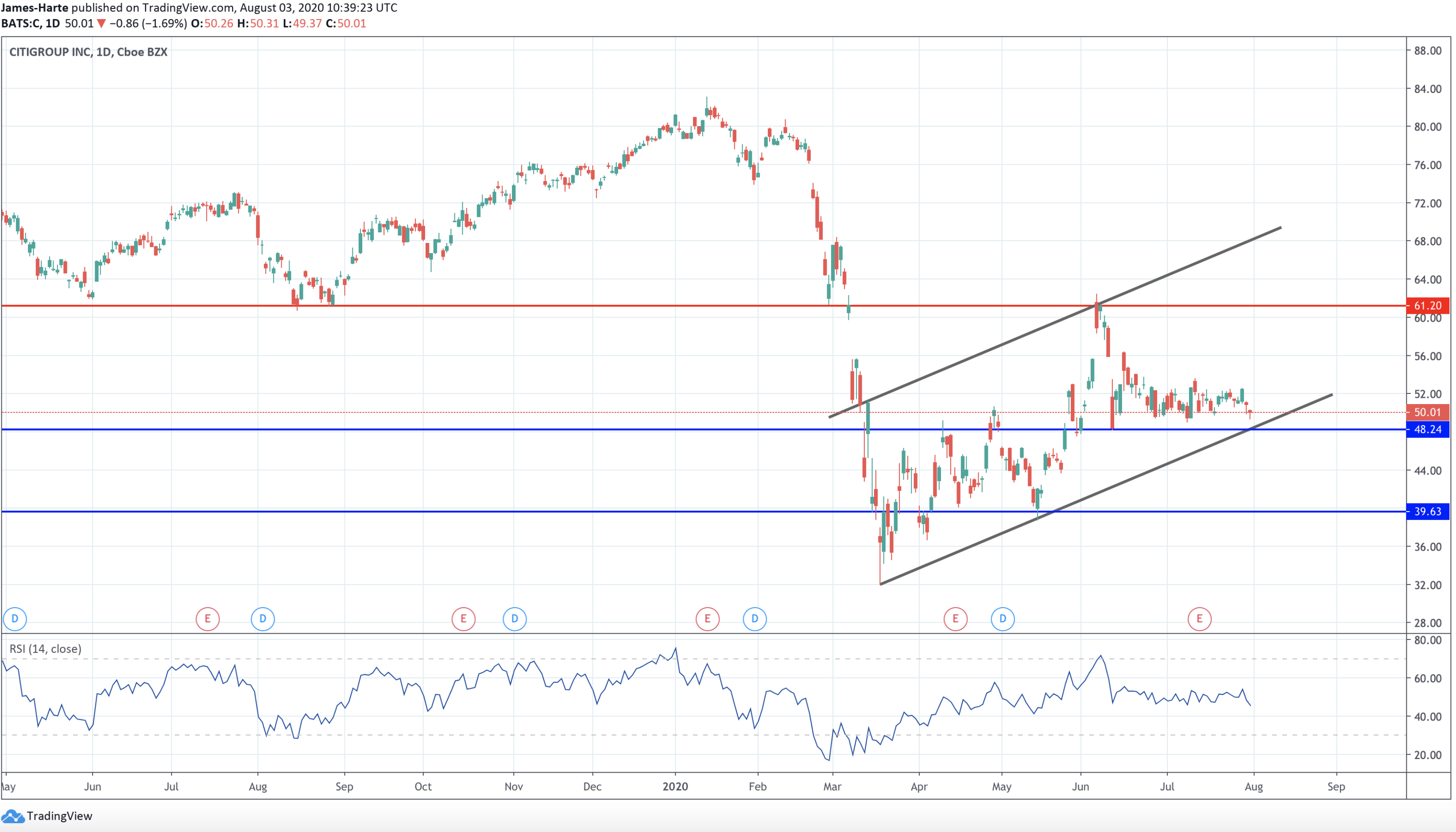 Shares in US banking firm Citigroup are trading 1.7% lower pre-market on Monday. Price has remained within a tight block of consolidation since the group reported Q2 earnings in mid-July. This is despite better than expected results.