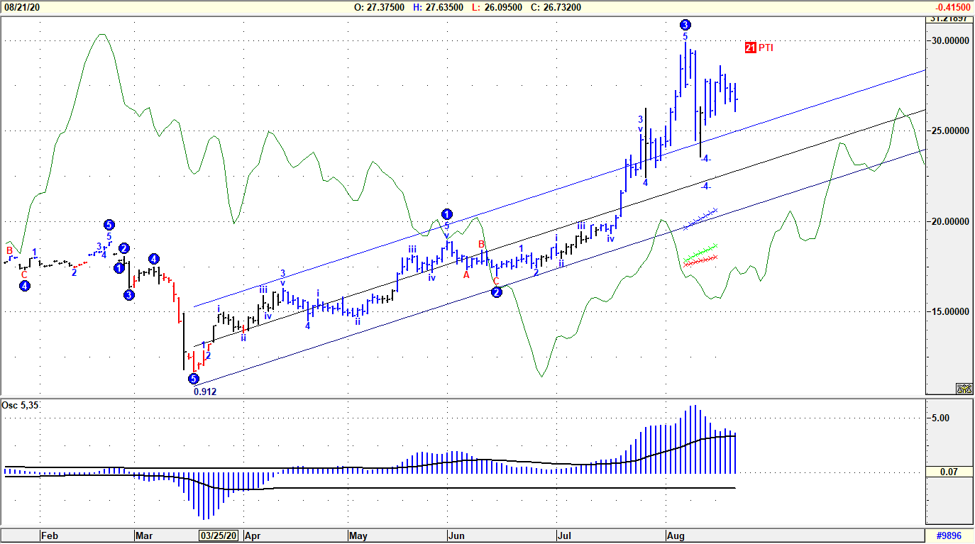 Come commentato nel precedente report, l’Argento dopo l’esplosione rialzista con target centrato in area 26, cioè su 4 STDV rispetto alla retta di regressione che ne accompagna il rialzo dallo scorso marzo, ha consolidato in stretta correlazione all’andamento dell’Oro e successivamente espresso nuovo boost per target in area 30 Dollari. Per le implicazioni tecniche assunte possiamo notare come allo stato attuale sia assente la fase di “metal-rotation”, cioè una maggior attenzione degli operatori focalizzata adesso sull’Argento piuttosto che sull’Oro. Questa stretta correlazione tra i due metalli indica che siamo entrati in fase espansiva per entrambi, difficilmente perimetrabile in termini di obiettivi, ma di elevata magnitudo. Strutturalmente per il Silver dovrebbe essere in corso uno sviluppo correttivo con incastro di Onda 4 e target potenziale su quota 24.60, peraltro già testato ma in attesa di essere validato.