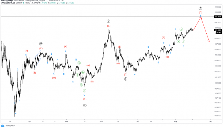 The GBPJPY structure hints to a triple zigzag consisting of primary waves Ⓦ-Ⓧ-Ⓨ-Ⓧ-Ⓩ.