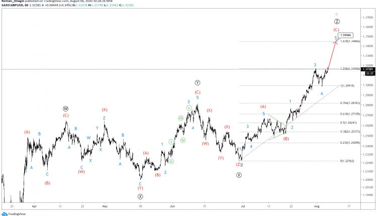 The current GBPUSD formation hints at a triple zigzag pattern. It consists of five primary waves Ⓦ-Ⓧ-Ⓨ-Ⓧ-Ⓩ.