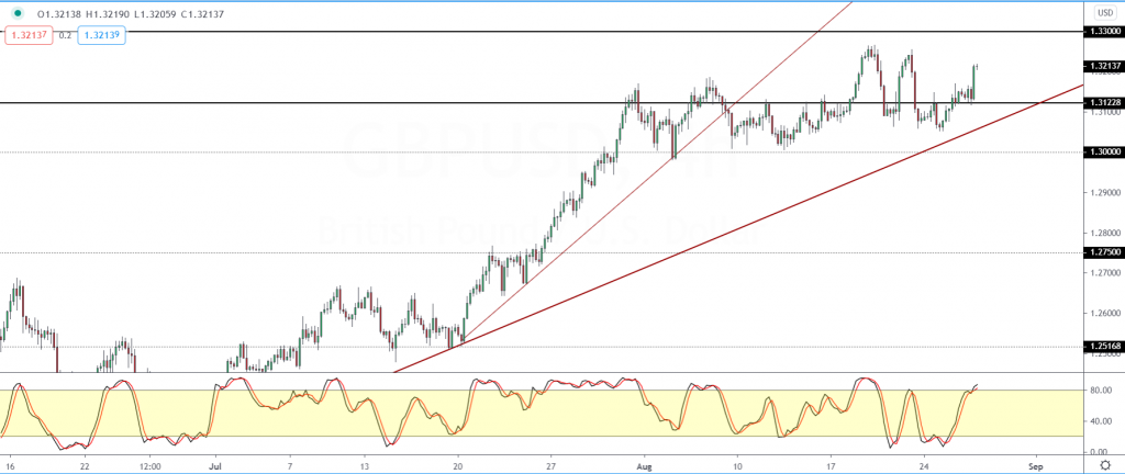 With support forming at this level, we could expect to see further gains. For the moment, GBPUSD will need to break out above the previous highs at 1.3262.