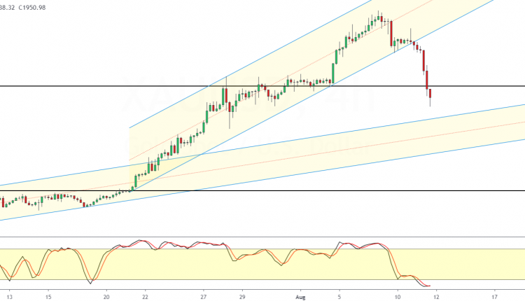 Gold is down over 3.5% intraday after it broke out from the rising price channel.