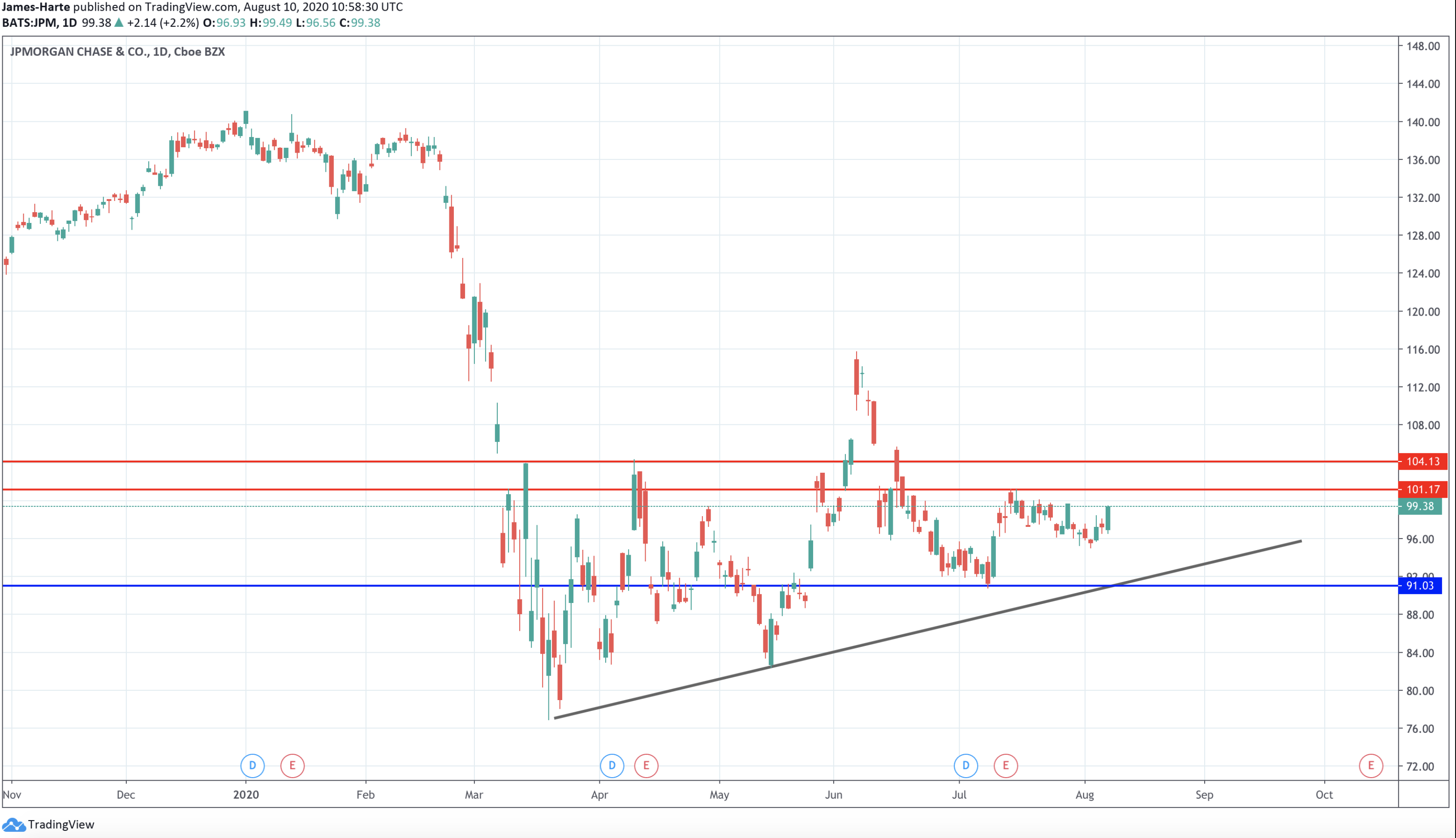 JP Morgan shares have turned lower since the post-lockdown recovery highs which peaked around the 116 level. However, still above the rising trend line from year to date lows, price has found support at the 91.03 level. While this level holds the focus is on further upside in the near term. The next two key resistance levels to watch are the 101.17 level and the 104.13 level above.