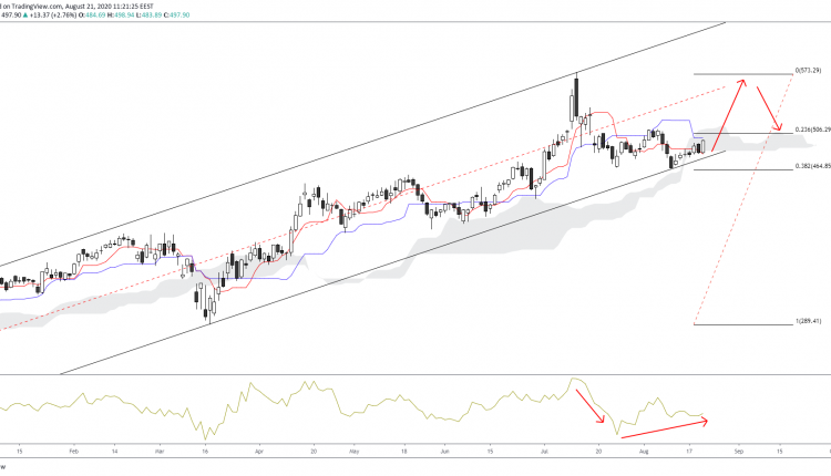 A test on the lower regression channel eyes a bounce towards 38.2% of the Fibonacci retracement. However, should we see exhaustion on momentum, then the focus will shift on a break in the channel and a move to previous lows towards $400.