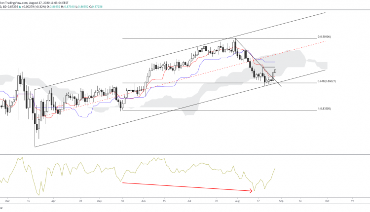 With prices engulfed in the Ichimoku cloud, the median regression is now the next target. Following this, another attempt to fresh highs towards the 0.90 region can be expected.