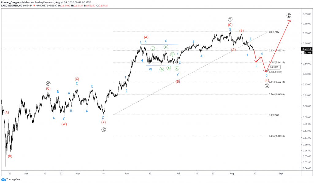 The NZDUSD pair hints to a bullish triple zigzag. The structure consists of five sub-waves Ⓦ-Ⓧ-Ⓨ-Ⓧ-Ⓩ of a primary degree.