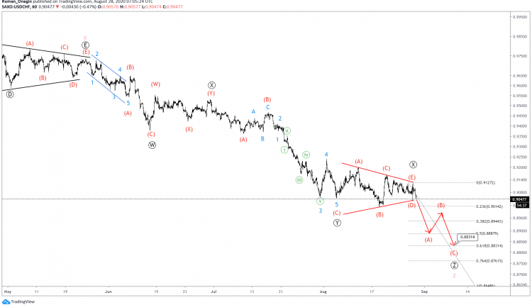 The USDCHF formation hints to a triple zigzag Ⓦ-Ⓧ-Ⓨ-Ⓧ-Ⓩ pattern in cycle wave z .